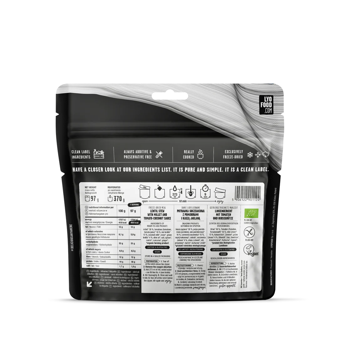 Индийска класика, пренесена в планината. Lentil Dal е плътна и ароматна яхния от червена леща, задушена бавно в кремообразен кокосово-доматен сос, допълнена с безглутеново просо и фино хрупкави зелени лещени зърна за текстура. Това напълно растително ястие е перфектно решение за всяко outdoor приключение – засищащо, вкусно и 100% органично.